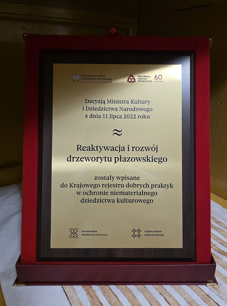 „Reaktywacja i rozwój drzeworytu płazowskiego” to tytuł wpisu do Krajowego rejestru dobrych praktyk w ochronie niematerialnego dziedzictwa kulturowego. Dziedzina to: wiedza i umiejętności związane z rzemiosłem tradycyjnym.