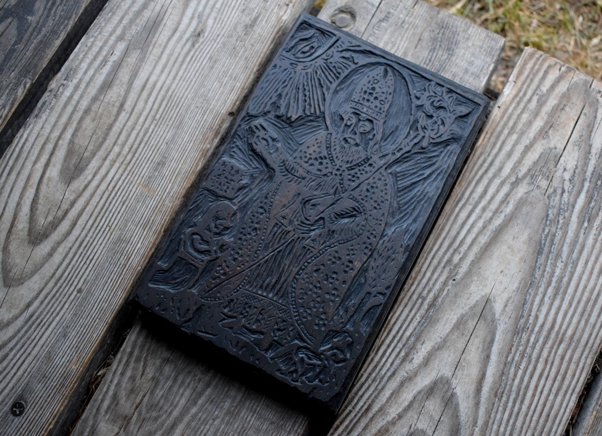 Kopia drzeworytu ludowego z Płazowa ze św. Mikołajem udostępniona na Festiwal Folkowisko w 2016 roku przez Muzeum Etnograficzne w Krakowie