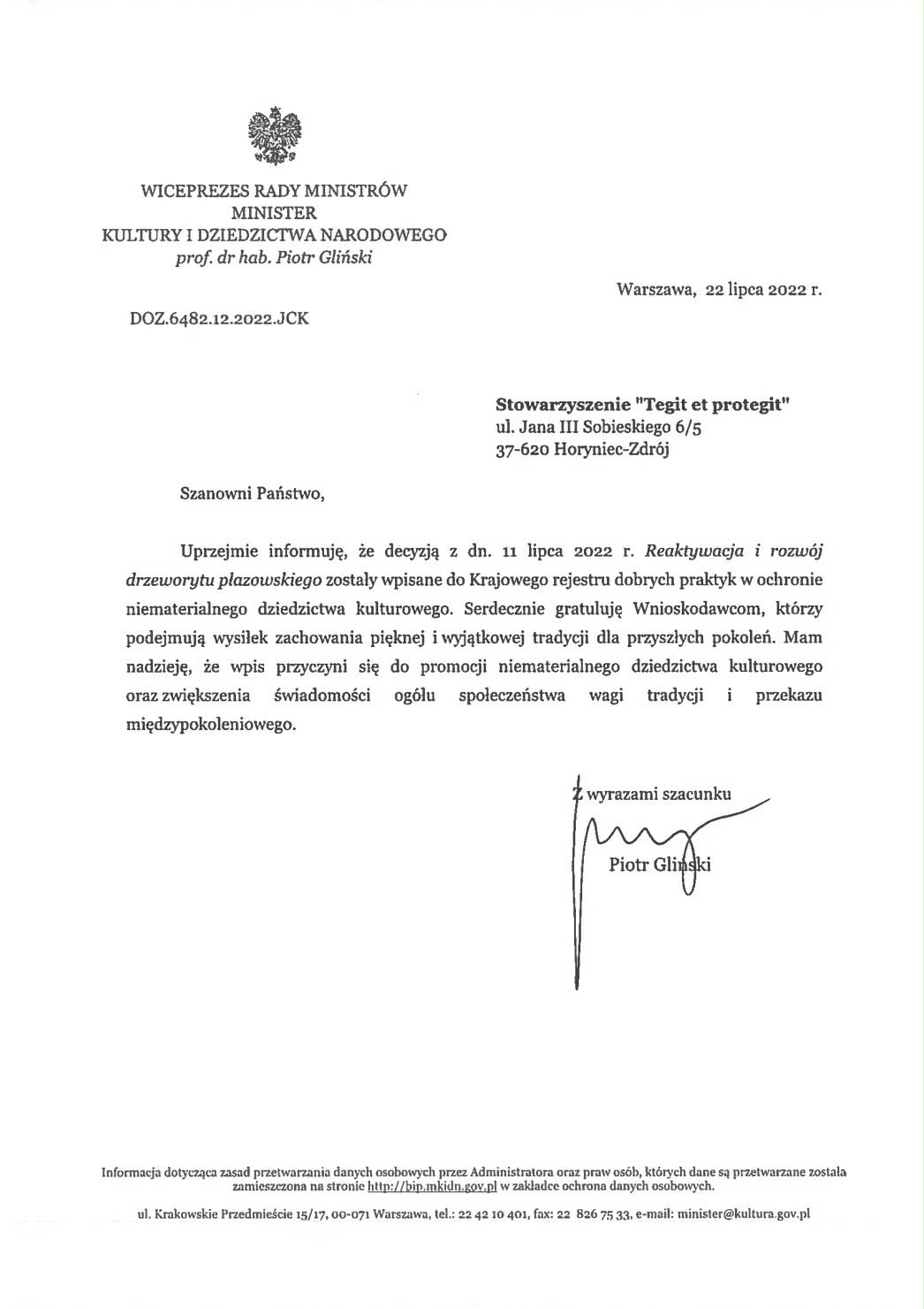 11 lipca 2022 roku udaje się uzyskać wpis dla „Reaktywacji i rozwoju drzeworytu płazowskiego” do Krajowego rejestru dobrych praktyk w ochronie niematerialnego dziedzictwa kulturowego prowadzonego przez Narodowy Instytut Dziedzictwa. Wpis jest akceptowany i podpisywany przez Ministra Kultury i Dziedzictwa Narodowego. Poniżej dokument z decyzją o wpisie.