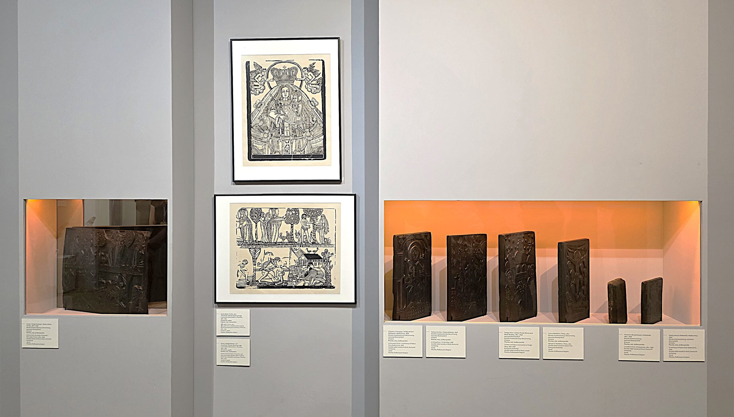 Na wystawie możemy z bliska zobaczyć detale ludowego drzeworytu. Warto zwrócić uwagę na z jednej strony precyzję, z drugiej niedoskonałość cięć!